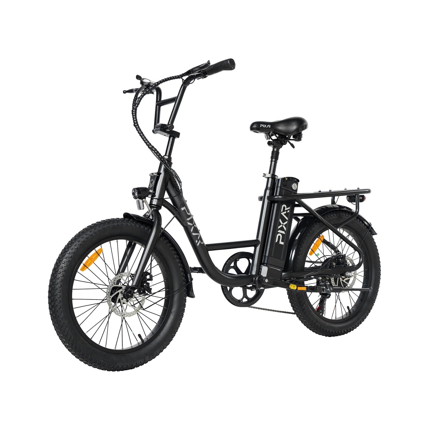 The PIXAR Fun1 combines a stylish aesthetic with practical design elements. Its step-through steel frame makes mounting and dismounting effortless, enhancing accessibility for riders of all skill levels. The bike’s modern look is complemented by 20″ × 3″ Chaoyang puncture-resistant tires that provide stability and traction on a variety of urban surfaces, from smooth pavements to light gravel paths.